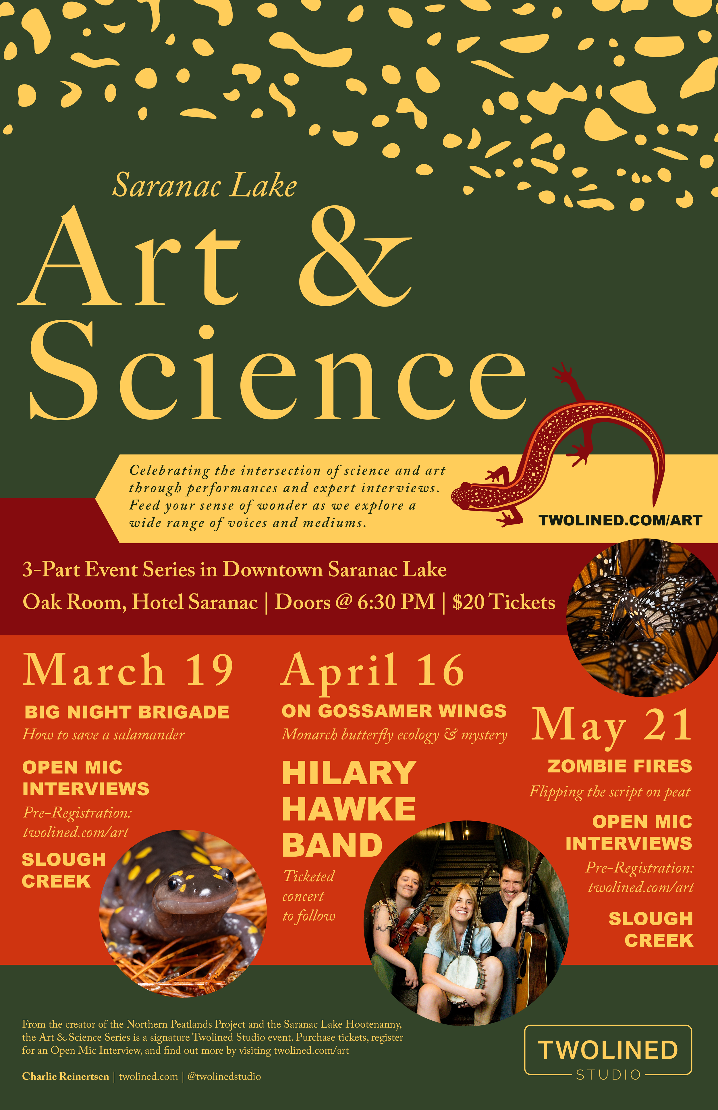 The Adirondacks are home to a sometimes hidden community of artist/scientists. Leaders in climate research, wildlife ecology, and botany are moonlighting as artists, interpreting their data in artistic displays, working to connect the public to their work through non-traditional pathways, coping with the grief of their findings, or celebrating the hidden workings of the world around us in captivating songs, paintings, poetry, and works of art.