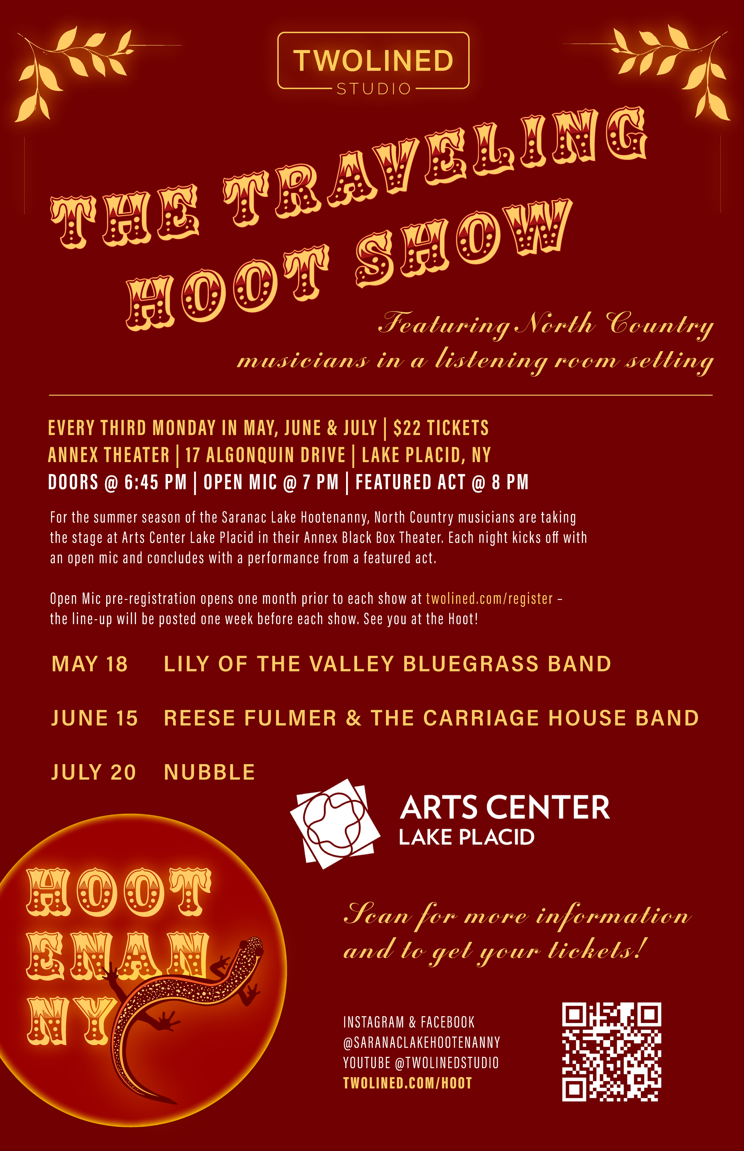 You can stream the Hoot by visiting the Twolined Studio Youtube Channel. You can also stay up on Hoot news by following @saranaclakehootenanny on Instagram and Facebook.