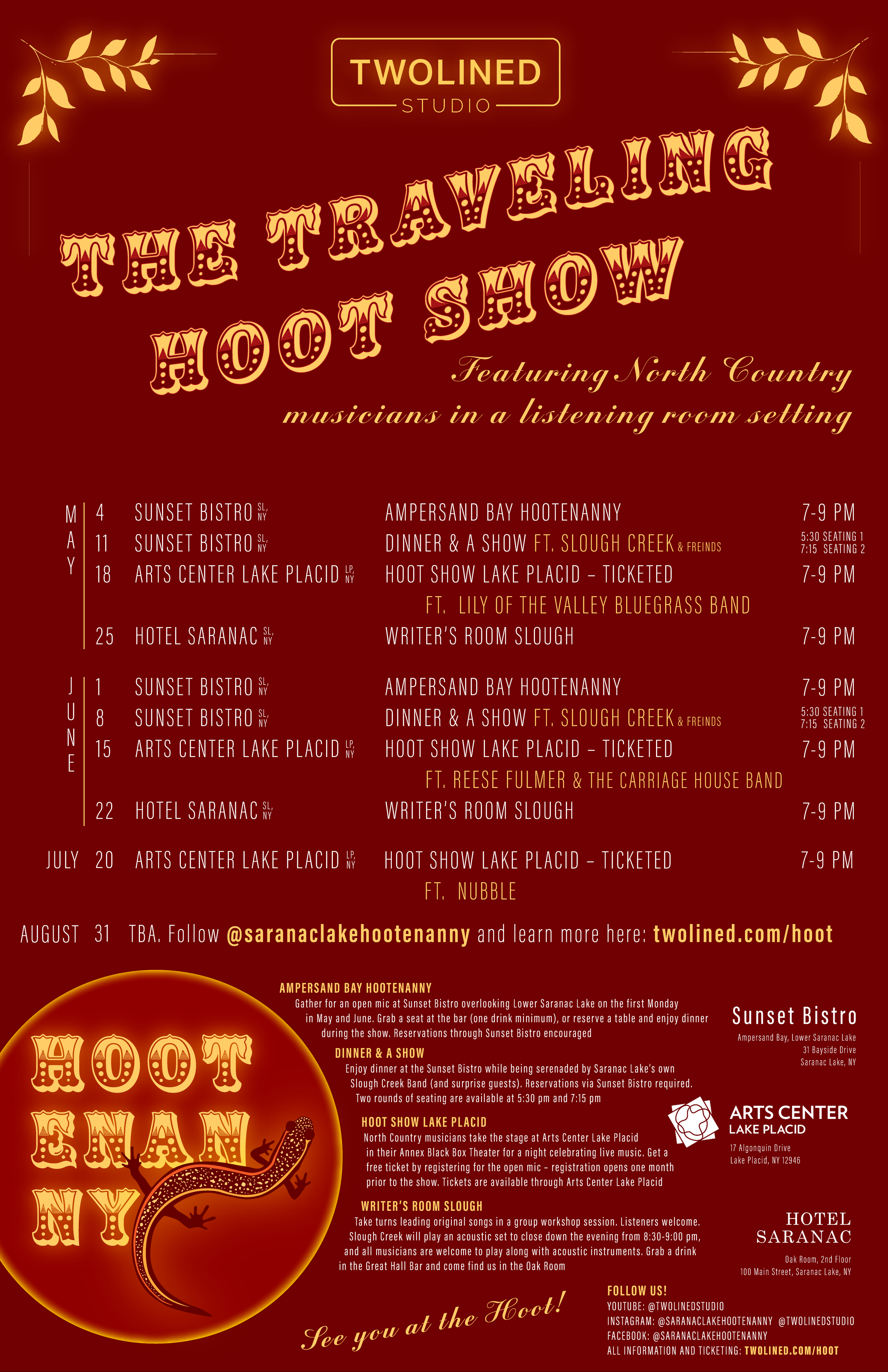 After more than two years of the Saranac Lake Hootenanny, the show is hitting the road! The Traveling Hoot Show is a series of live music events held in the heart of Adirondack Park. Hosted and produced by Charlie Reinertsen of Twolined Studio, musicians and listeners are welcome Monday nights at venues throughout the North Country. Check out the season schedule to learn about the unique listening room settings we will be visiting in 2026. If you would like to bring the Hoot to your town or venue next season, send Charlie a note!